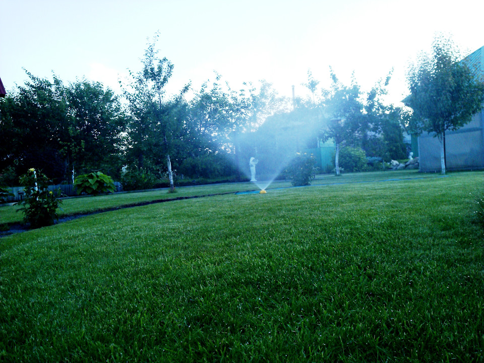 После того как семена с удобрениями засыпаны тонким слоем земли, весь газон обильно поливаем водой. В первое время газон нужно поливать один раз каждый день. Через две-три недели газон взойдёт. По газону за сорняками не ходить! Пусть растут! Потом когда газон отрастёт до 5-7см, его можно будет аккуратненько прополоть первый раз.